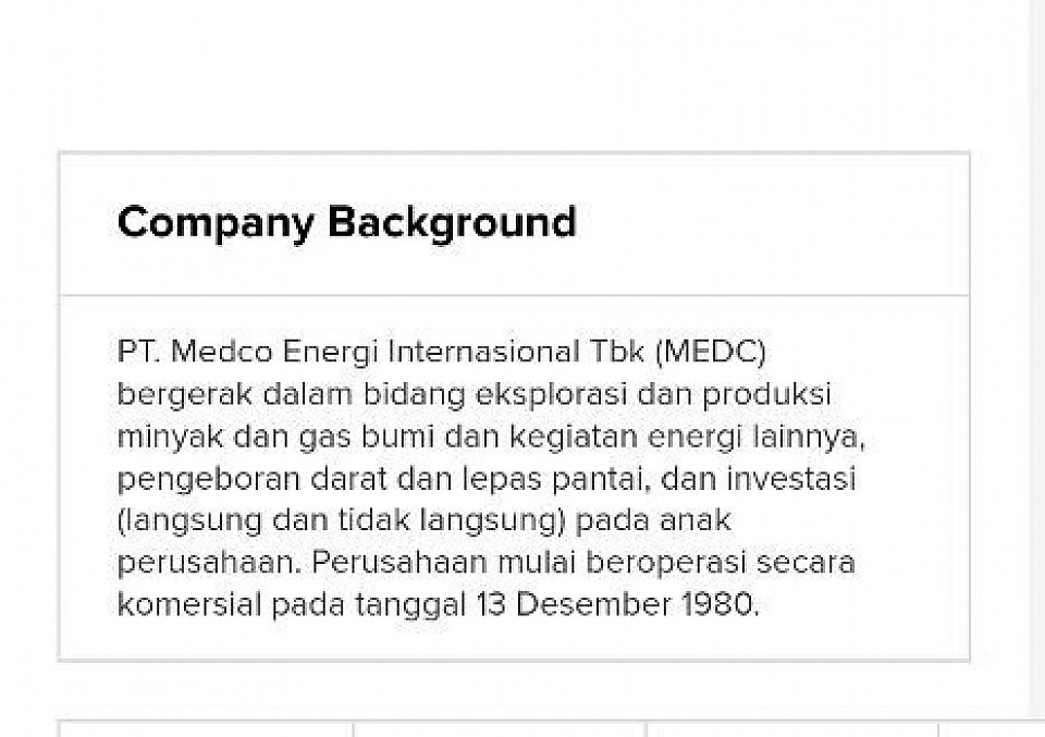 Begitu juga dengan investasi (langsung dan tidak langsung) pada anak perusahaan, dilakukan perusahaan ini. MEDC, mulai beroperasi secara komersial pada tanggal 13 Desember 1980.
